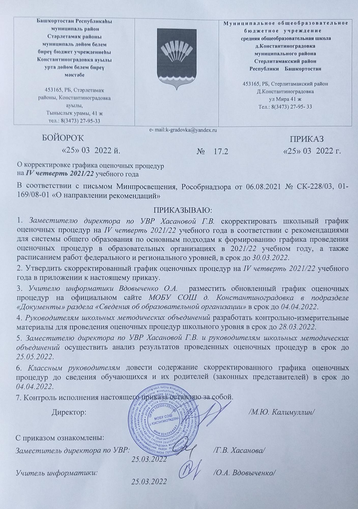 Приказ о корректировке графика оценочных процедур на 4 четверть 2021-2022 учебный год